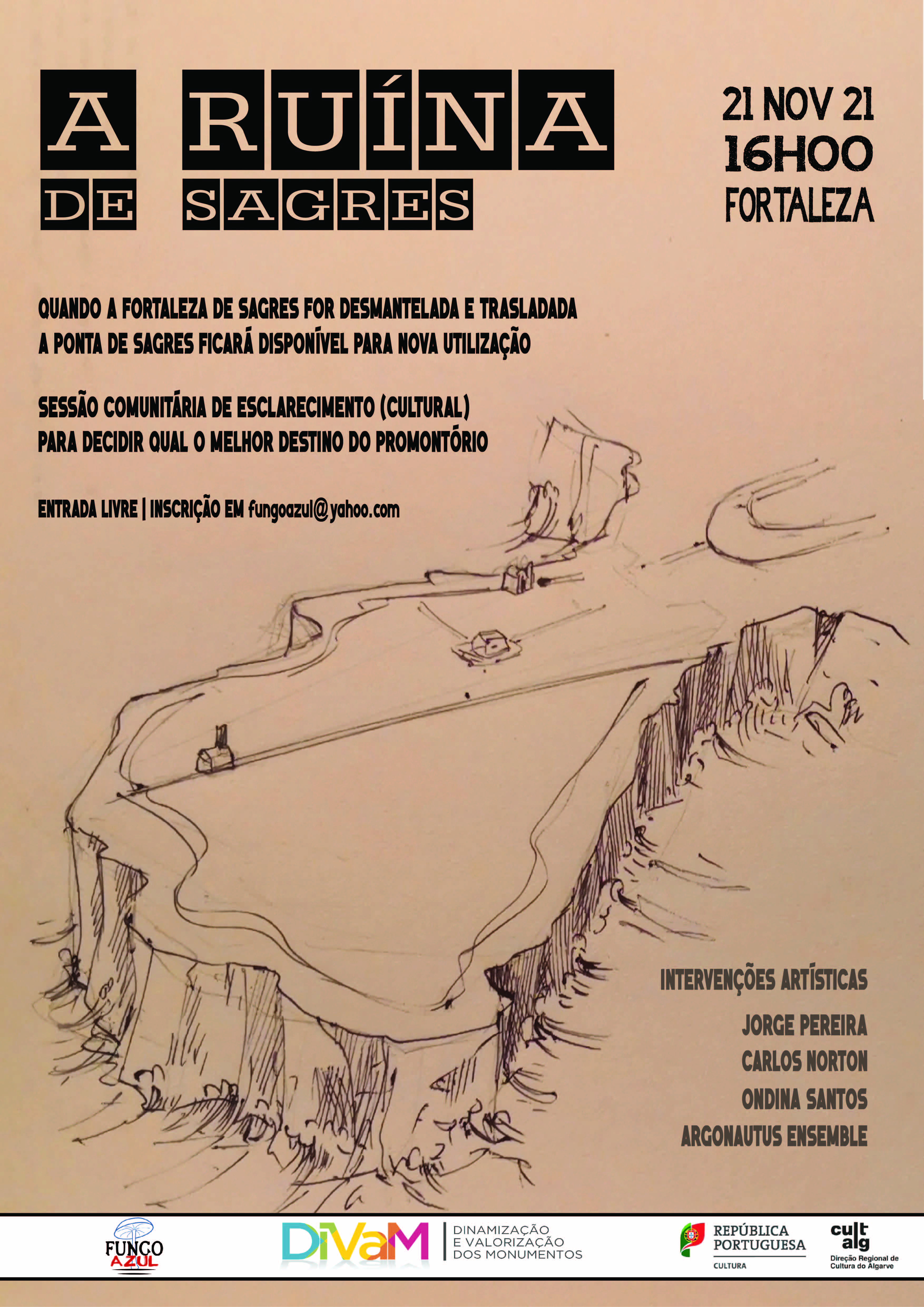 A apresentação da exposição “A Ruína de Sagres”, onde se inclui uma performance de Ondina Santos, a partir de um texto de Carlos Norton e com música de Argonautus Ensemble, terá lugar no dia 21 de novembro, pelas 16 horas, na Fortaleza de Sagres. O projeto, da autoria da Fungo Azul – Associação Cultural, teve como ponto de partida para todo o processo criativo uma provocação à população de Sagres, em que foram desafiados a refletir sobre um eventual desmantelamento do monumento.
