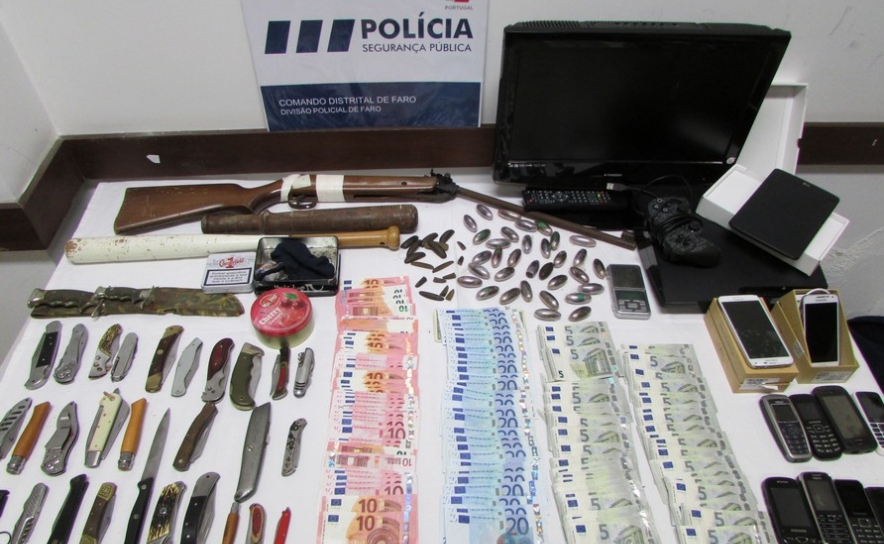 - Em Faro, na sequência de investigação levado a cabo pela Esquadra de Investigação Criminal (2 meses), sobre venda de Produto Estupefaciente à comunidade estudantil de Faro, concretamente junto de Escolas Secundárias desta cidade, deu-se cumprimento a Mandado de Busca e Apreensão, tendo sido apreendido 390 gramas de Haxixe em Bolotas, o equivalente a 780 doses no valor de 1600€ (mil e seiscentos euros), cerca de 1500€ em notas do Banco Central Europeu, cerca de 25 armas brancas entre elas, punhais, facas automáticas, canivetes e outros, telemóveis e outras armas por uso.