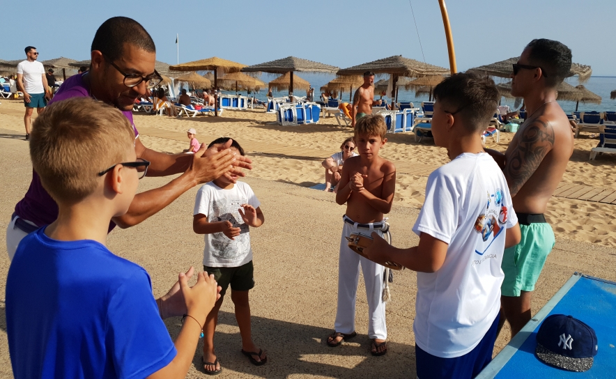 Uma aula muito animada com os petizes a aprenderem os primeiros movimentos da filosofia Capoeira, ministrada pelo Mestre Moita da Associação Alegria e Bem-Estar, em Quarteira.