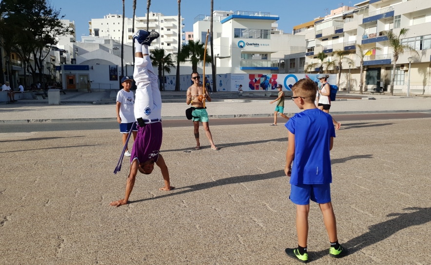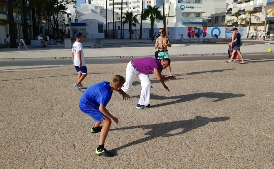 A Praça do Mar, em Quarteira, foi palco na passada sexta feira dia 19 ao fim da tarde de uma aula aberta de Capoeira Kids com o Mestre Moita.