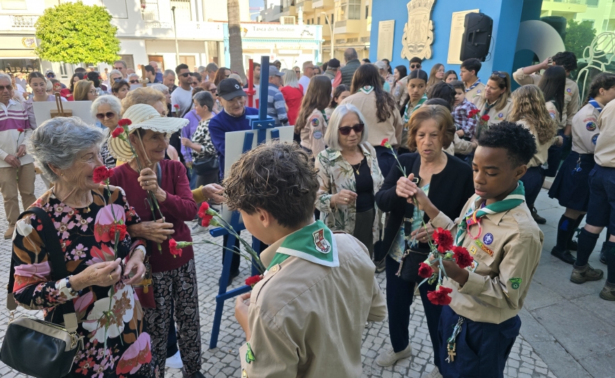 A cerimónia teve início com o tradicional hastear da bandeira ao som do Hino Nacional, interpretado por Lígia Pereira, e contou com a presença do presidente da Câmara Municipal de Loulé, Telmo Pinto, e do vice-presidente David Pimentel, do presidente da Junta de Freguesia de Quarteira, João Romão, e demais membros do executivo, bem como dos representantes das várias bancadas partidárias na Assembleia de Freguesia de Quarteira, num momento de união política que demonstra que Abril conseguiu o que poucos regimes conseguiram: que adversários políticos possam celebrar juntos a liberdade que os une. Seguiu-se a largada de pombos ao som de “Grândola Vila Morena” , de Zeca Afonso, canção que serviu de senha às forças militares na madrugada do 25 de Abril de 1974 e que se tornou o símbolo maior da Revolução. Um momento de forte carga simbólica, em que os pombos brancos a voar sobre Quarteira representaram a paz, a esperança e a liberdade conquistada há mais de meio século e que, como os pombos, deve ser sempre cuidada para não fugir. Como já é tradição, foram também oferecidos cravos vermelhos à comunidade, com a colaboração dos Escuteiros de Quarteira – Agrupamento 1052. O cravo vermelho, que dá nome à Revolução, foi distribuído a todos os presentes, num gesto simples mas profundo de homenagem àqueles que tornaram possível o fim da ditadura e o início de um regime democrático. Muitas pessoas levaram os cravos para casa, outras colocaram-nos na lapela, pequenos gestos que, somados, fazem a memória perdurar.