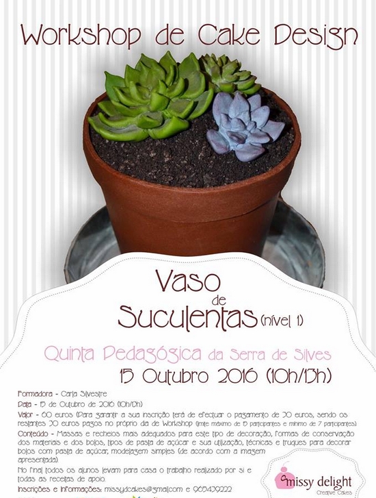 O valor da inscrição é de 60 euros (pagamento de 50% do valor no ato da inscrição e 50% no dia do workshop). Para participar, os interessados deverão efetuar a inscrição através dos seguintes contactos: email missydcakes@gmail.com e telemóvel 965439222.