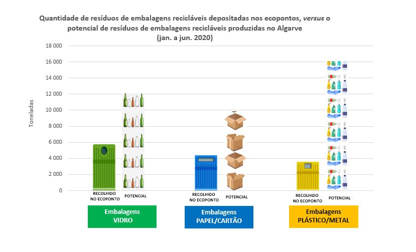 De janeiro a junho de 2020 a Algar recolheu cerca de 14 mil toneladas de resíduos recicláveis nos ecopontos, no entanto, a população depositou o dobro de recicláveis nos contentores dos resíduos indiferenciados, nesse mesmo período, inviabilizando a sua reciclagem (ver gráfico abaixo).