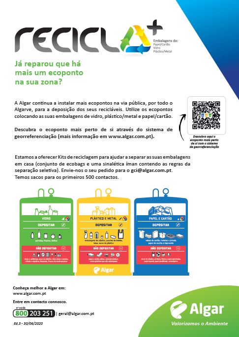 Em simultâneo, a empresa está a promover uma ação de sensibilização RECICLA+ a qual, para além de divulgar a instalação destes equipamentos e esclarecer sobre as regras de utilização dos ecopontos, incentiva à utilização dos mesmos. A empresa está a oferecer kits de reciclagem (ecobags e sinaléticas) aos primeiros 500 contactos que dirigirem o seu pedido para o email gci@algar.com.pt.