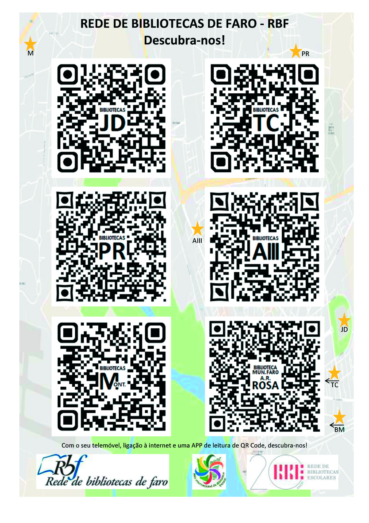 Para assinalar os 20 anos da Rede de Bibliotecas de Faro e o mês de outubro, mês das Bibliotecas Escolares, os agrupamentos escolares do Concelho de Faro e a Biblioteca Municipal de Faro criaram um QR Code com as suas Bibliotecas e divulgaram na cidade, podendo assim, partilhar e dar a conhecer o que se faz nas Bibliotecas Escolares e na Biblioteca Municipal de Faro.