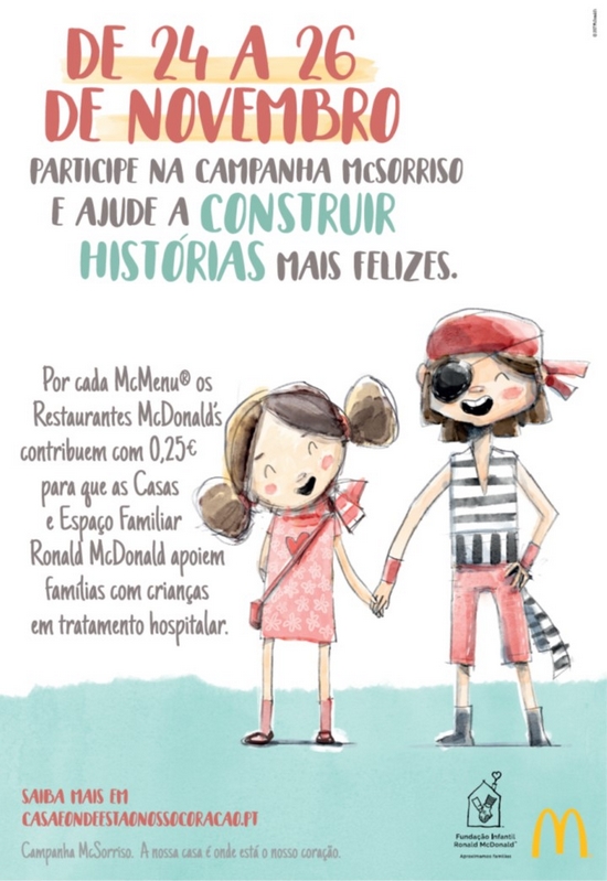 A iniciativa McSorriso, criada em 2002, já permitiu que os restaurantes McDonald’s em Portugal contribuíssem com mais de um milhão de euros para a Fundação Infantil Ronald McDonald e, este ano, pretende-se continuar a ajudar as Casas Ronald McDonald e o Espaço Familiar Ronald McDonald a cumprirem a sua missão: aproximar as famílias e as suas crianças e contribuir para o seu bem-estar, quando mais precisam de estar próximos dos seus e receber o seu apoio e carinho.