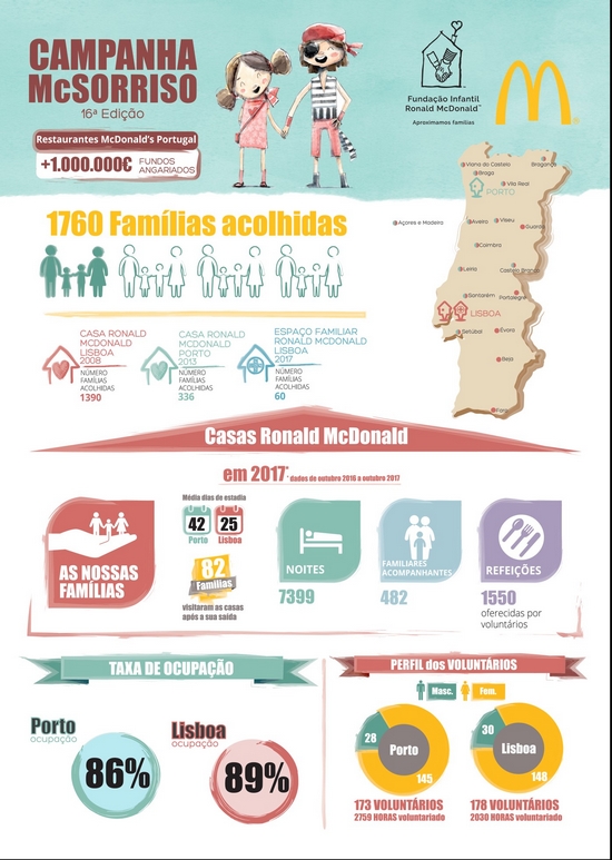 No total, as duas Casas Ronald McDonald já acolheram mais de 1700 famílias, incluindo 496 do Algarve. A Fundação Infantil Ronald McDonald abriu, em junho de 2017, o primeiro “Espaço Familiar Ronald McDonald”, localizado no Hospital de Santa Maria, que já recebeu mais de 60 famílias.