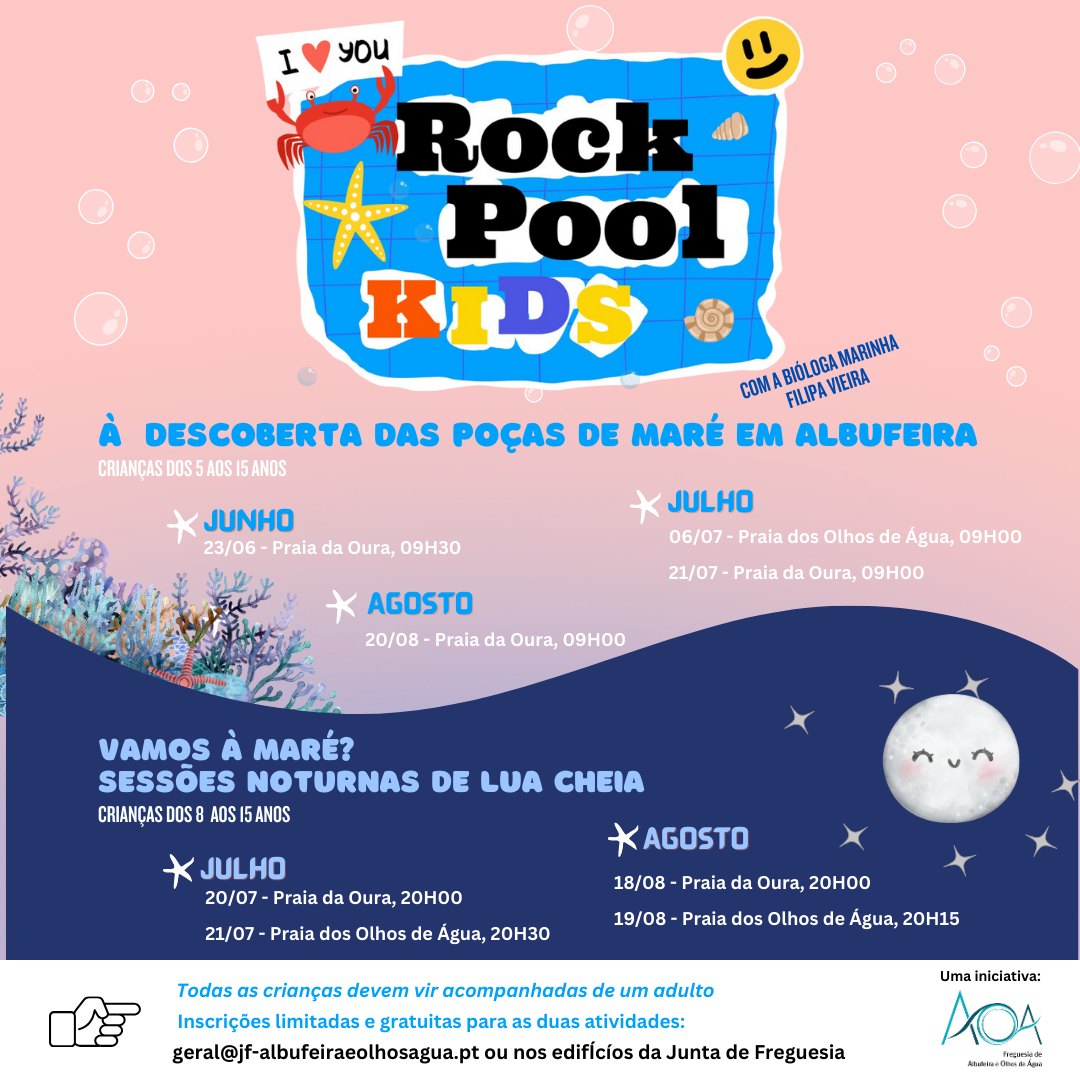 As sessões de Rock Pool Kids prosseguem nas praias de Albufeira e Olhos de Água, numa atividade organizada pela Junta de Freguesia de Albufeira e Olhos de Água e dinamizada pela bióloga marinha Filipa Vieira, que se destina a crianças com idades compreendidas entre os 5 e os 15 anos.