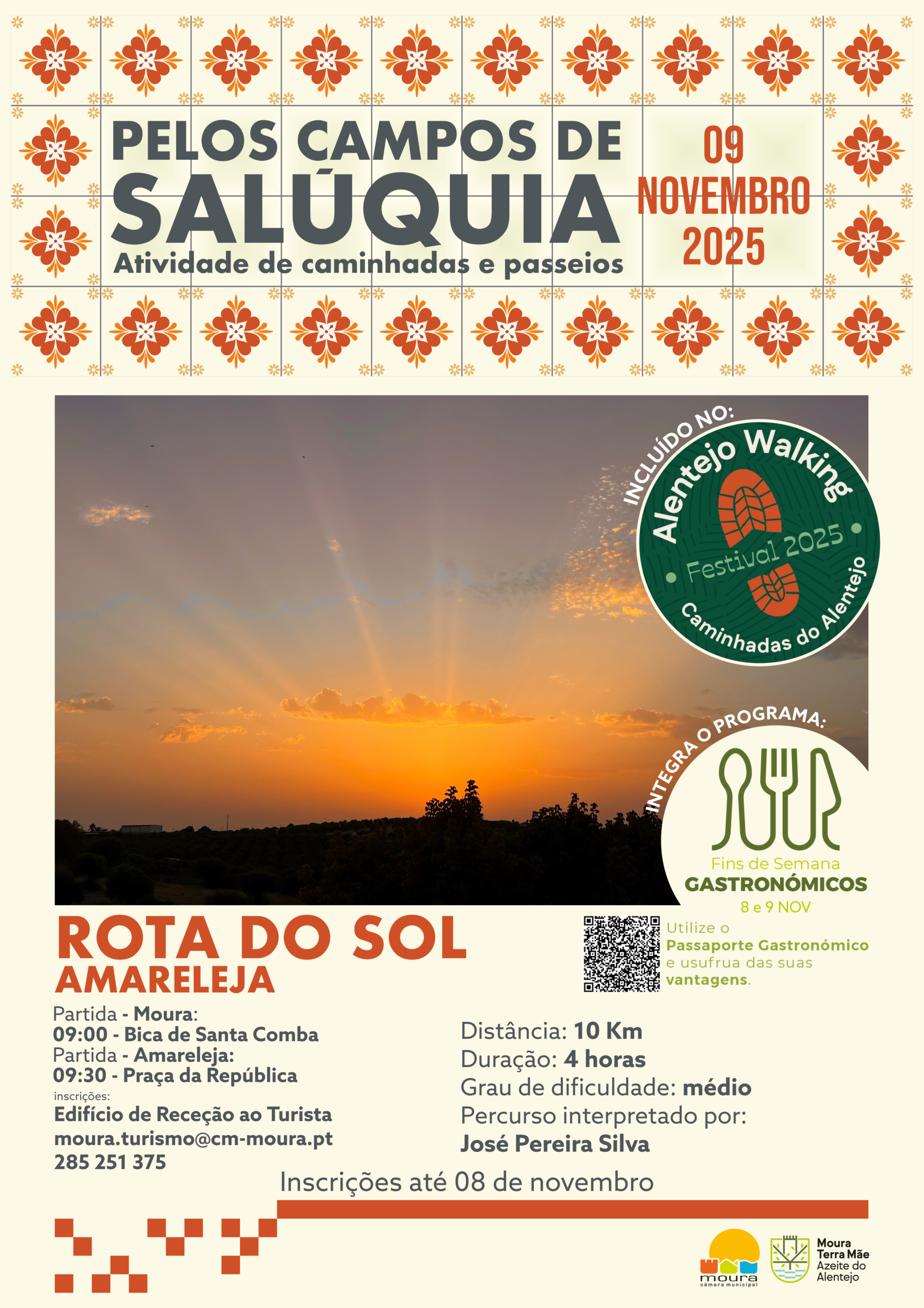 A iniciativa, com a designação Rota do Sol, propõe um percurso de 10 quilómetros, com duração aproximada de 4 horas e grau de dificuldade médio, que convida os participantes a explorar os trilhos e paisagens da freguesia de Amareleja, no concelho de Moura. O ponto de partida está marcado para as 9:00, junto ao Castelo de Moura – Edifício de Receção ao Turista.