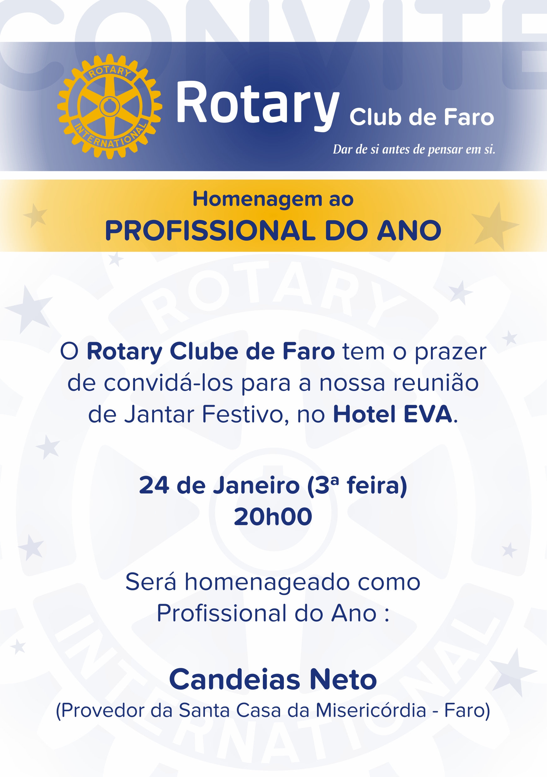É uma honra para o Rotary Club de Faro homenagear Candeias Neto, prestando-lhe publicamente o reconhecimento como “ Profissional do Ano”.