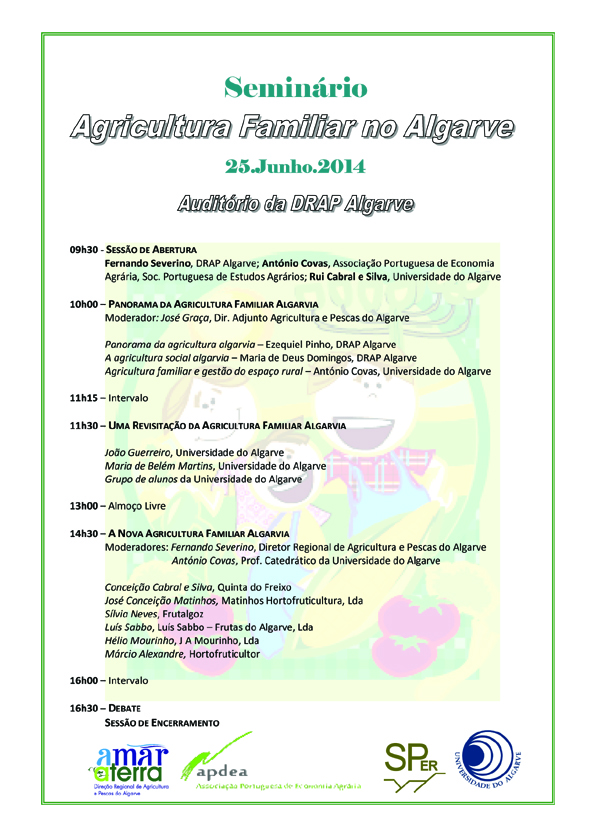 O referido seminário é realizado no âmbito do Ano Internacional da Agricultura Familiar, numa iniciativa da Direção Regional de Agricultura do Algarve, da Associação Portuguesa de Economia Agrária, da Sociedade Portuguesa de Estudos Agrários e da Universidade do Algarve.