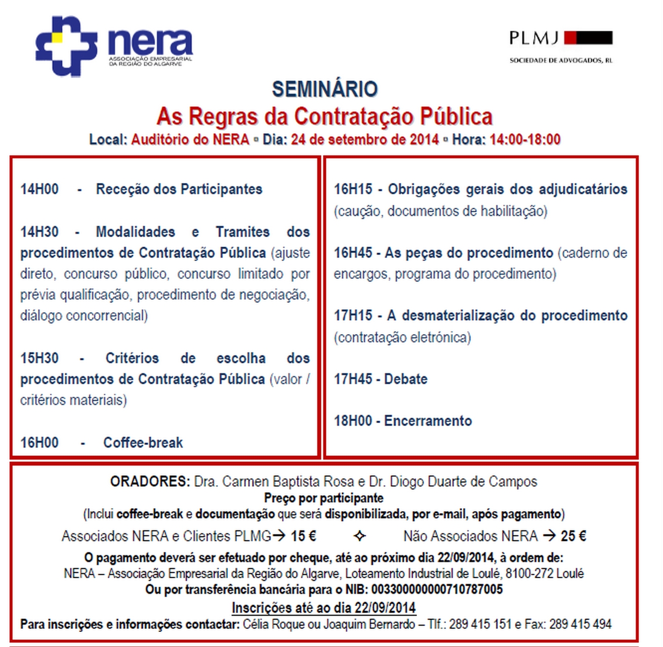 Para o efeito, o NERA em parceria com a PLMJ – Sociedade de Advogados, R.L., irá promover a realização de um Seminário subordinado ao tema “As Regras da Contratação Pública”, com o objetivo de esclarecer sobre as referidas regras, adotada pelo código dos contratos públicos, tal como os procedimentos pré-contratuais e a execução dos contratos, de modo a que as empresas possam preparar devidamente tais propostas e tornarem-se assim mais competitivas entre os demais agentes económicos.