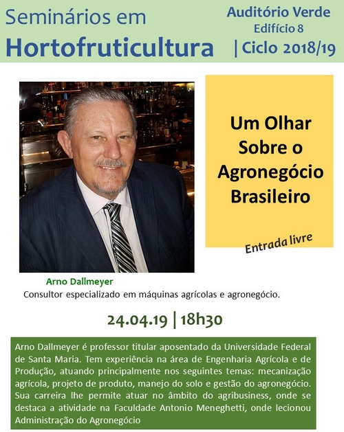 Com o título "Um Olhar Sobre o Agronegócio Brasileiro", este seminário é apresentado por um agrónomo brasileiro, com doutoramento em Agronomia (Energia na Agricultura) e longa experiência em mecanização agrícola, máquinas agrícolas, projeto de produto, manejo do solo e gestão do agronegócio.