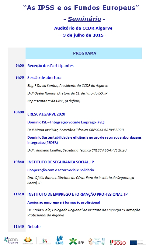 No próximo dia 3 de julho, das 09h00 às 12h00, realiza-se nas instalações da CCDR Algarve, em Faro, um Seminário sobre o tema "As IPSS e os Fundos Europeus”, coorganizado pela Comissão de Coordenação Regional e Desenvolvimento Regional do Algarve e Confederação Nacional das Instituições de Solidariedade (CNIS).