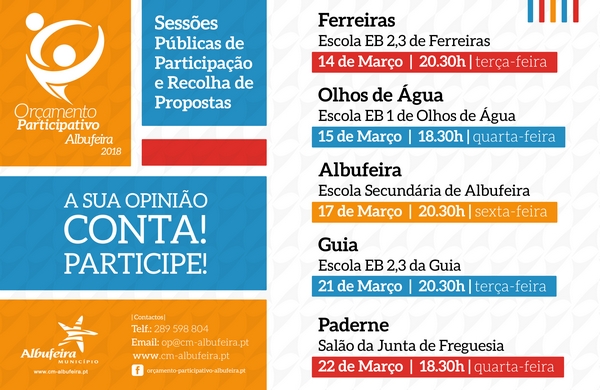 A primeira reunião está agendada para dia 14 de março (terça-feira), pelas 20h30, na Escola EB 2,3 de Ferreiras. As sessões públicas de participação do OP têm por objetivo promover a recolha de propostas de investimento, desta feita para ser aplicado em projetos na área da Acessibilidade e Mobilidade, tendo a Autarquia definido para o efeito uma verba no valor de 250 mil euros, a maior desde sempre, ou seja desde de 2014, o ano em que a Câmara Municipal de Albufeira decidiu implementar pela primeira vez esta importante ferramenta de gestão e estratégia partilhada com os cidadãos do seu concelho.