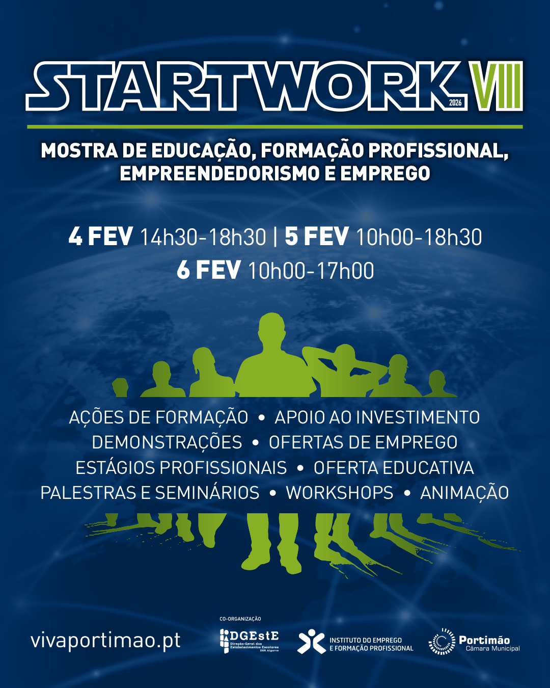 A Start Work VIII tem entrada livre e decorrerá entre as 14h30 e as 18h30 no dia 4, entre as 10h00 e as 18h30 no dia 5, e das 10h00 às 17h00 no dia 6. Tem organização conjunta da Câmara Municipal de Portimão, Instituto de Emprego e Formação Profissional e Direção-Geral dos Estabelecimentos Escolares – Direção de Serviços da Região do Algarve.
