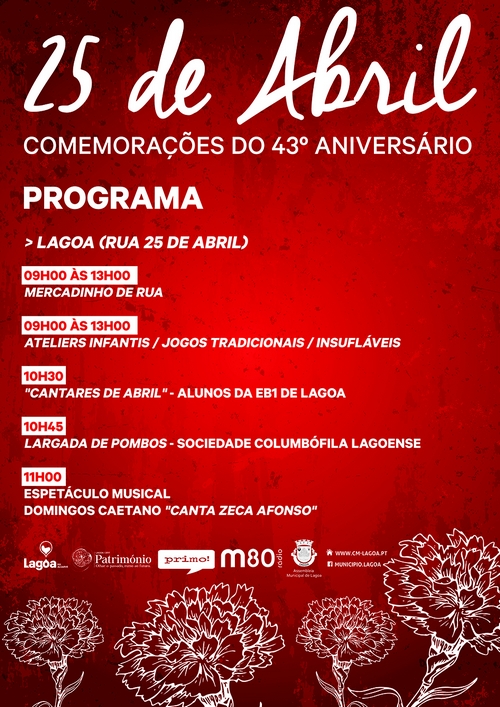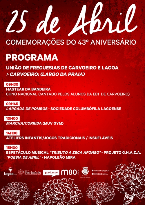 Em Carvoeiro, no Largo da Praia, vai decorrer a cerimónia do hastear da bandeira pelas 9h30, uma largada de pombos e uma marcha/corrida coorganizada pelo Muv Gym, às 10h00. Para a tarde, está prevista animação para os mais novos, com jogos e insufláveis e a partir das 15h00 terá lugar também um tributo a Zeca Afonso pelo projeto G.H.A.Z.A. e a declamação de ‘Poesia de Abril’ por Napoleão Mira.