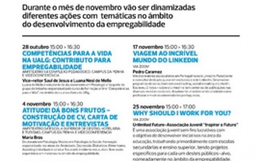De 28 de outubro a 25 de novembro, o Gabinete Alumni vai promover várias iniciativas dinamizadas por especialistas que irão abordar diferentes temáticas no âmbito da empregabilidade.