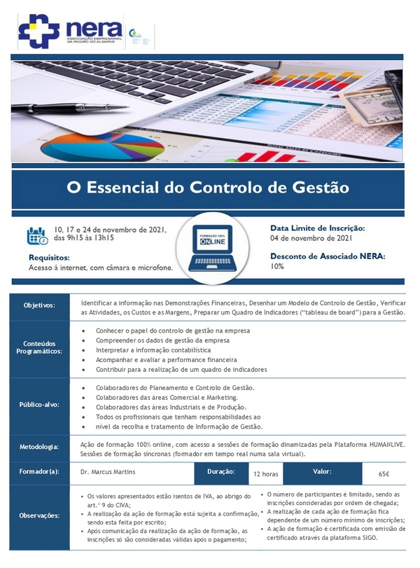 Com o objetivo de no final da ação os participantes conseguirem Interpretar as Demonstrações Financeiras, Desenhar um Modelo de Controlo de Gestão, Acompanhar as Atividades, os Custos e as Margens, Estabelecer um Quadro de Indicadores (“tableau de board”) para a Gestão, nos dias 10, 17 e 24 de novembro de 2021, a ação de formação: O Essencial do Controlo de Gestão.