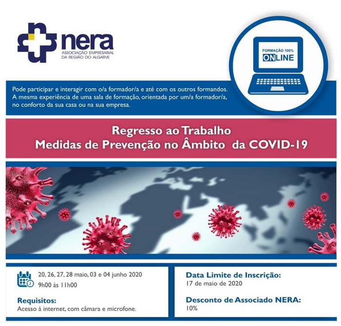 Com o objetivo de dotar os formandos relativamente às medidas de prevenção a adotar na empresa, no âmbito da COVID-19, o NERA irá realizar, nos dias 20, 26, 27, 28 de maio, 03 e 04 de junho de 2020*, entre as 09h00 e as 11h00, a ação de formação: Regresso ao Trabalho - Medidas de Prevenção no Âmbito da COVID-19.