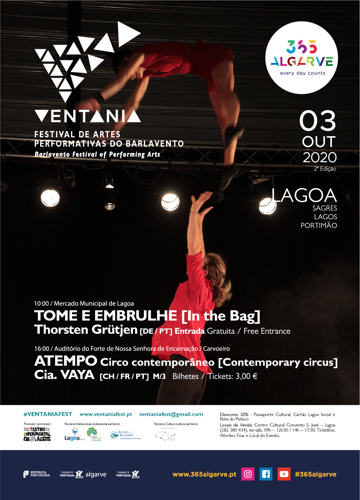 O Ventania - Festival de Artes Performativas do Barlavento é um projeto promovido pelo Teatro Experimental de Lagos no âmbito do programa cultural 365 Algarve, Região de Turismo do Algarve, em parceria com o Município de Lagoa, Portimão, Lagos e Vila do Bispo e Direção Regional de Cultura do Algarve.