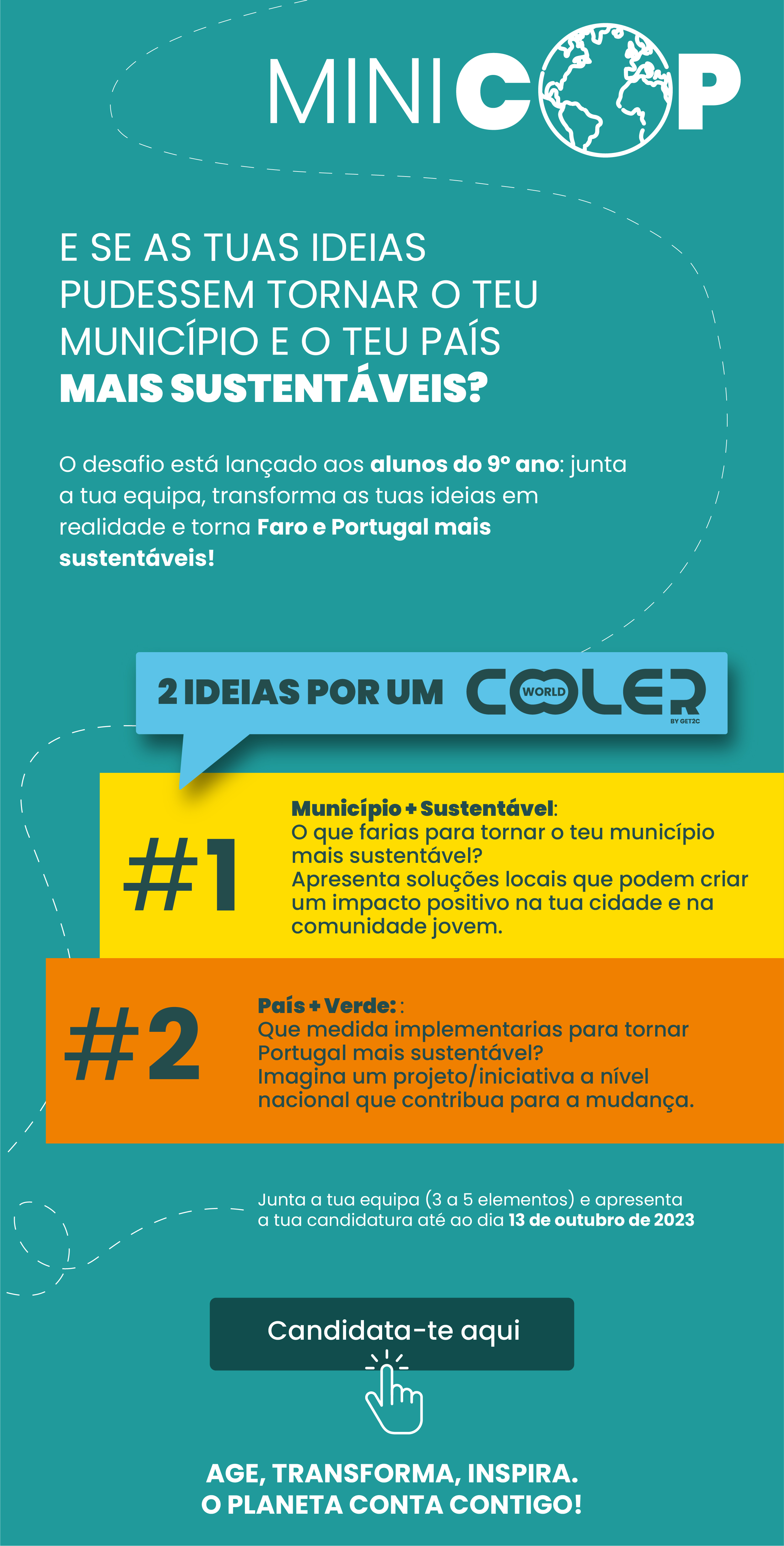 Esta ideia da realização da Mini COP tem como primeiro objetivo envolver os jovens estudantes do 9º ano, através de uma dinâmica escolar, que os leve a identificar ideias sustentáveis para mudar o seu município. As equipas, compostas por entre três a cinco elementos e um Professor responsável, deverão apresentar dois tipos de propostas de ideias: uma, que se destina a ser aplicada a nível municipal e outra a nível nacional.