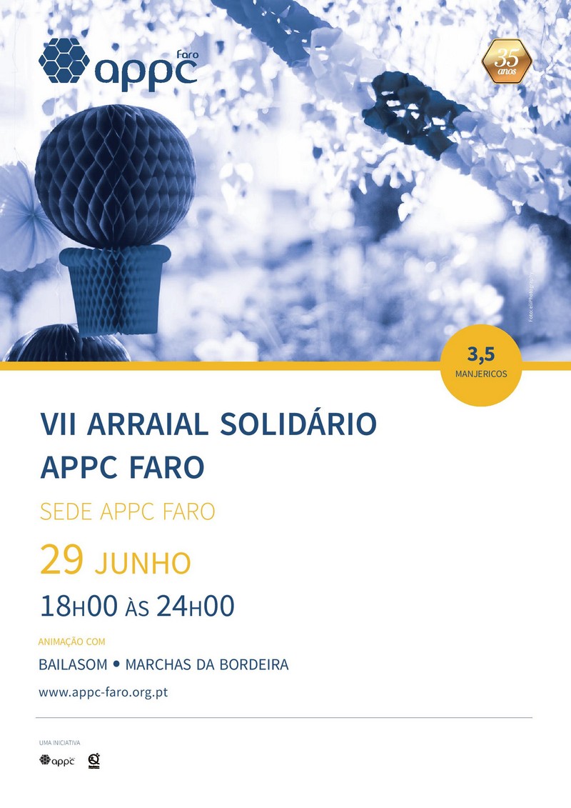A Associação Portuguesa de Paralisia Cerebral de Faro (APPC Faro) irá realizar no próximo dia 29 de junho de 2017, pelas 18h00, o VII Arraial Solidário para o qual estão todos, desde já, convidados.