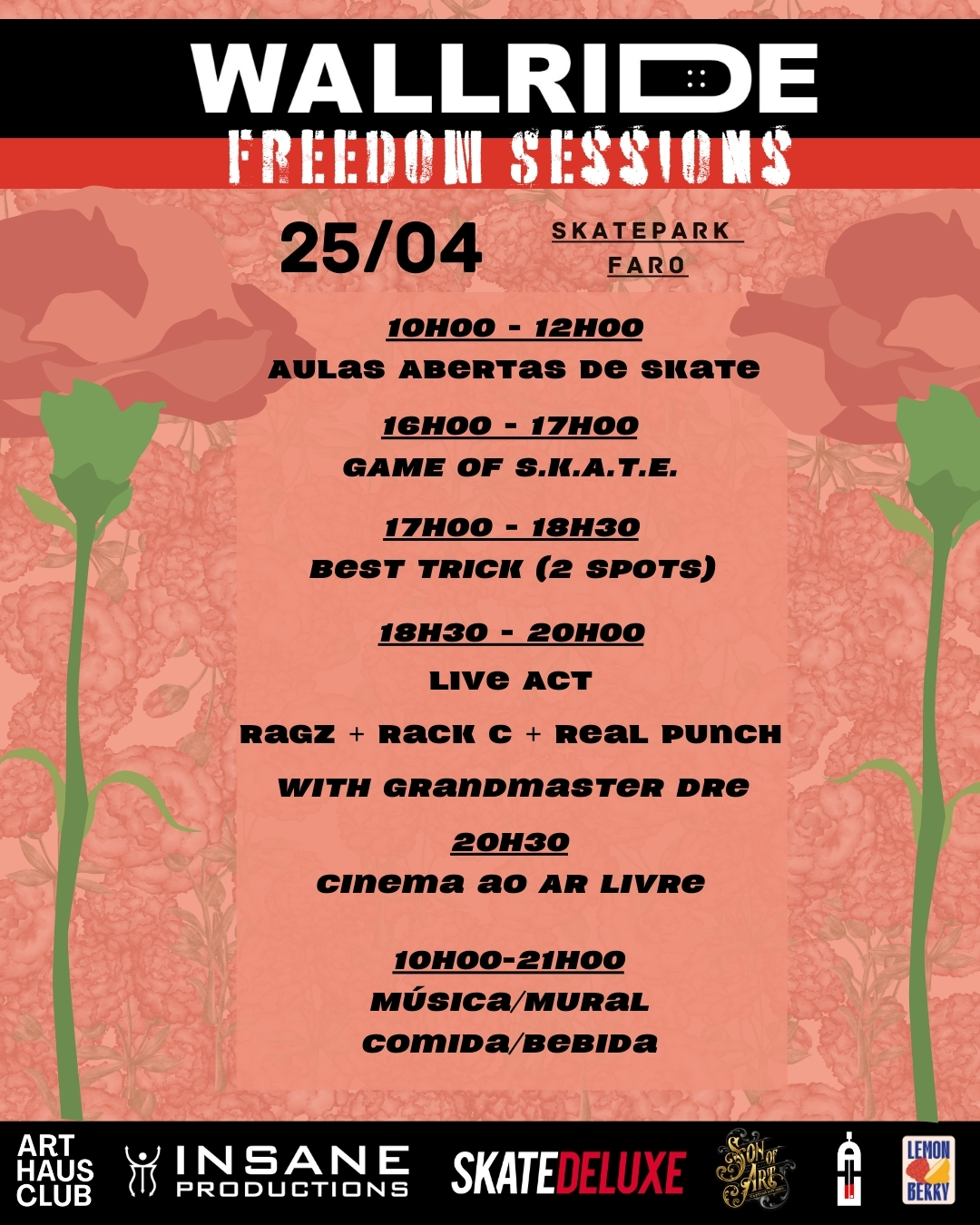 A Associação sem fins lucrativos de ação social na ótica do skate, WallRide, junta forças com a Insane Productions e ArtHaus Club para celebrar os 50 anos do 25 de Abril no skatepark de Faro.