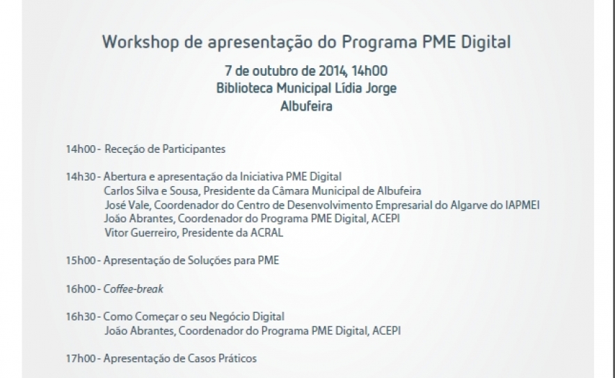No dia 7 de outubro, a partir das 14h00, realiza-se em Albufeira, na Biblioteca Municipal Lídia Jorge, o Workshop de Apresentação do Programa “PME Digital”, uma iniciativa conjunta da Câmara Municipal de Albufeira, Agência para a Competitividade e Inovação, I.P. (IAPMEI), Associação do Comércio Eletrónico e Publicidade Interativa (ACEPI) e Associação de Comércio e Serviços da Região do Algarve (ACRAL).
