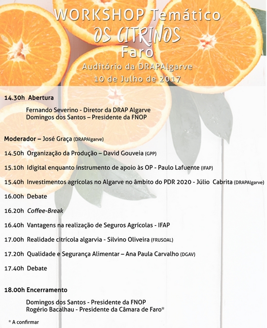Este Workshop tem como objetivos principais promover e divulgar a realidade da produção citrícola algarvia, dar a conhecer alguns dos instrumentos de apoio às Organizações de Produtores da Região, abordar alguns aspetos da Qualidade e Segurança Alimentar no setor, informar das vantagens da realização de seguros agrícolas, dar a conhecer os investimentos agrícolas no Algarve, nomeadamente os previstos no âmbito do PDR 2020.