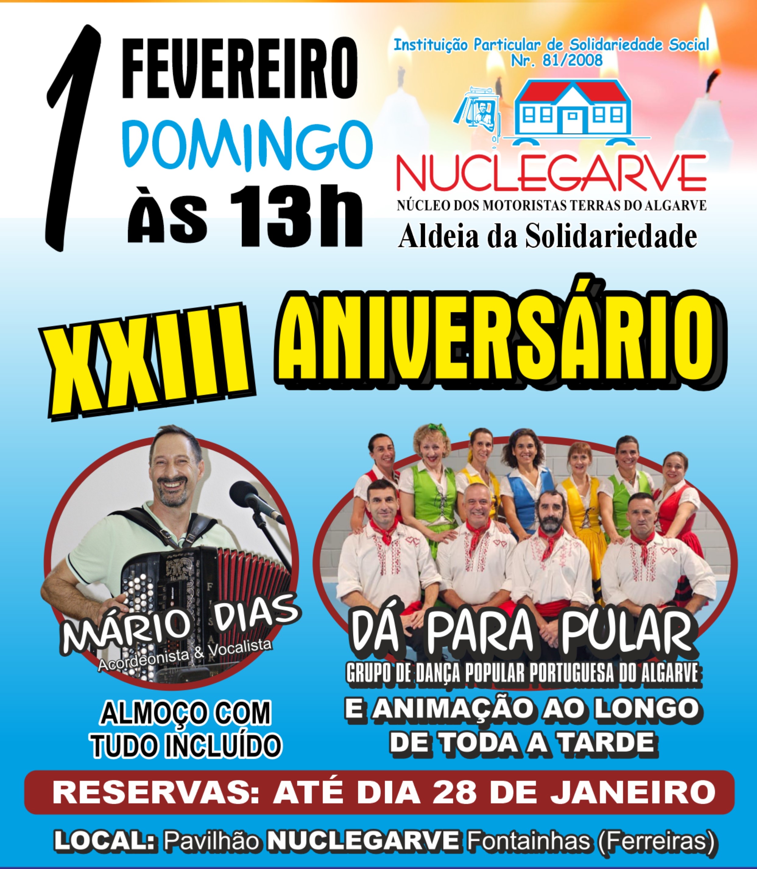 A Nuclegarve irá proporcionar uma tarde diferente com almoço, baile a cargo do artista Mário Dias e teremos como convidados especiais, o Grupo de Dança Popular Portuguesa do Algarve-Dá Para Pular.