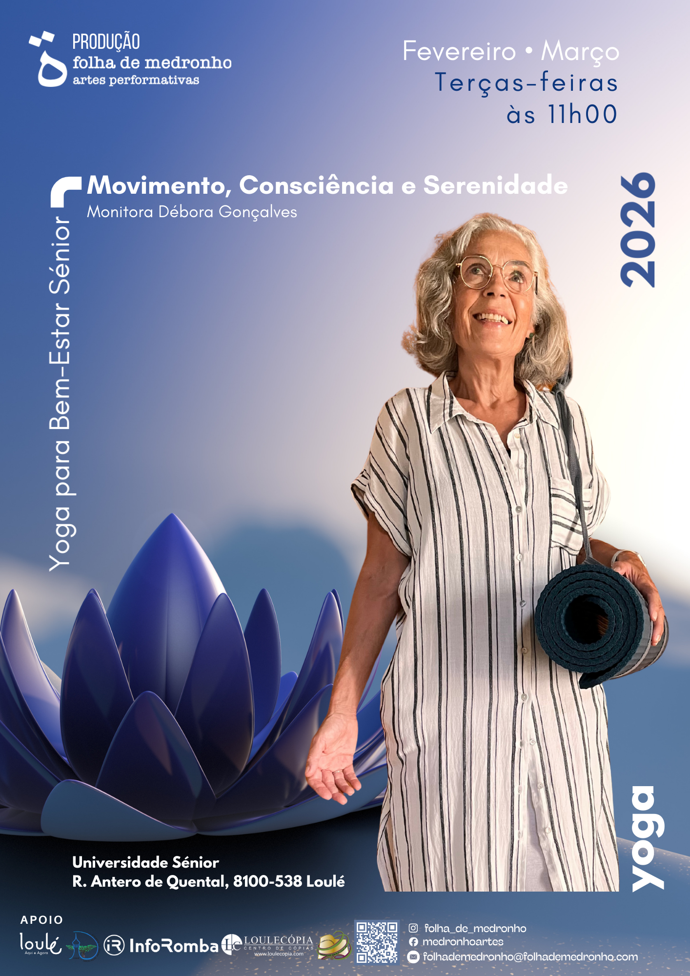 Aberto a todos os alunos da Universidade Sénior de Loulé, independentemente da experiência anterior com yoga, este projeto visa contribuir para uma vivência mais saudável, ativa e integrada do envelhecimento.