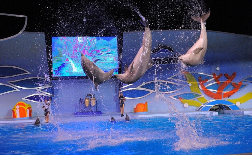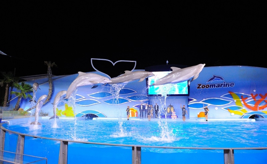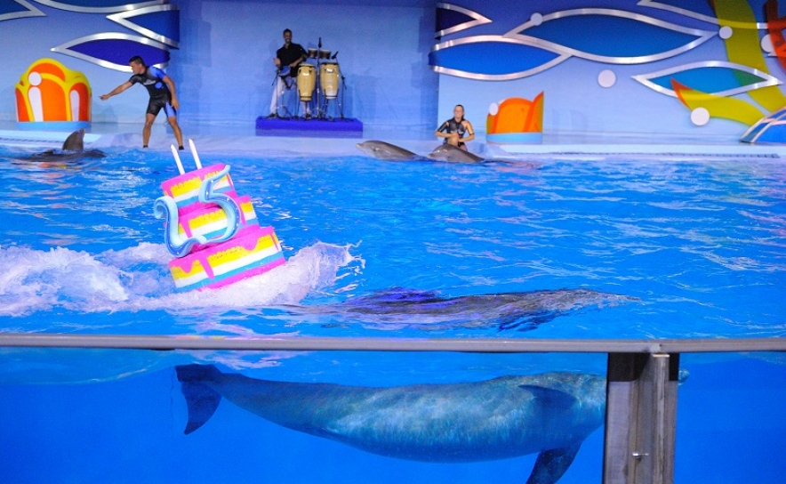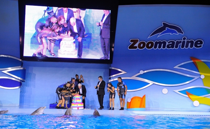 Para o final da noite estava reservado o momento alto, com a apresentação noturna de golfinhos e o cantar dos parabéns, brinde de champanhe e corte do bolo de aniversário dos 25 anos do Zoomarine!