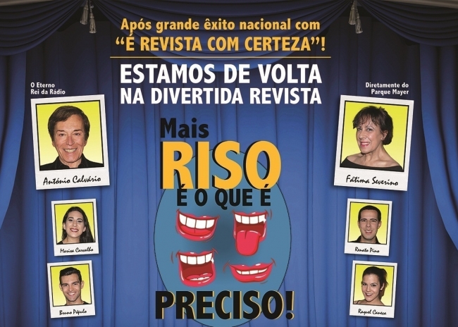 "Mais riso é o que é preciso!" é a Revista à Portuguesa que assinala o regresso aos palcos de António Calvário e que será apresentada sala do Centro Pastoral de Pêra, no dia 13 de novembro, pelas 21h30. Este evento tem o apoio da Câmara Municipal de Silves, União de Freguesias de Alcantarilha-Pêra, Comissão de Festas da Paróquia de Pêra e Centro Paroquial de Pêra.