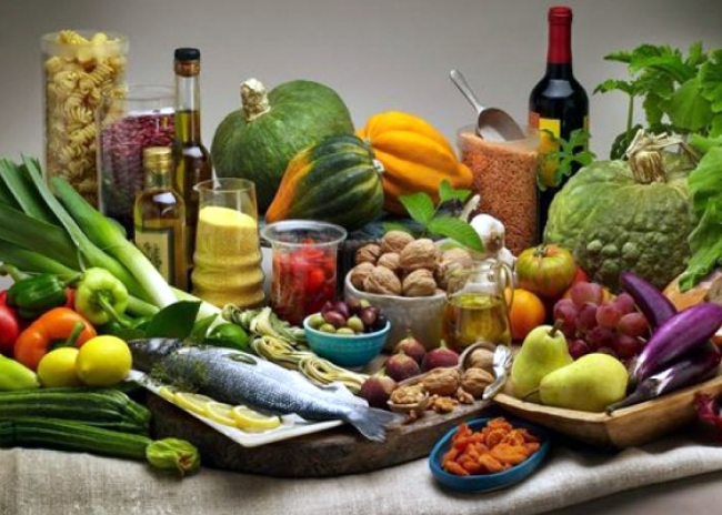 A Dieta Mediterrânea é caracterizada pela abundância de alimentos de origem vegetal, como o pão, massas, arroz, hortaliças, legumes, fruta fresca e frutos oleaginosos; utilização do azeite como principal fonte de gordura; consumo moderado de pescado, aves, lacticínios e ovos; consumo de pequenas quantidades de carnes vermelhas e ingestão moderada de vinho, geralmente durante as refeições.