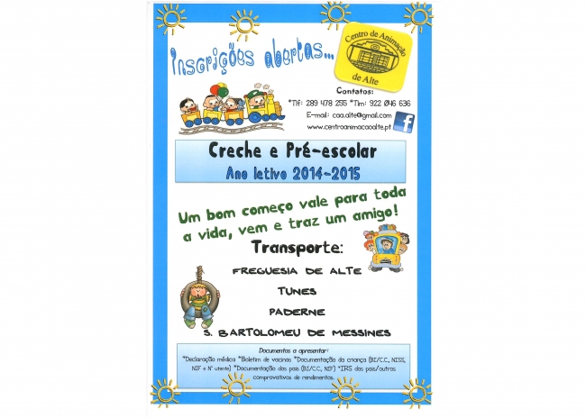 Já se encontram abertas as Inscrições e Renovações de Matrícula para o Ano Letivo de 2014-2015 no Centro de Animação de Alte, Loulé.