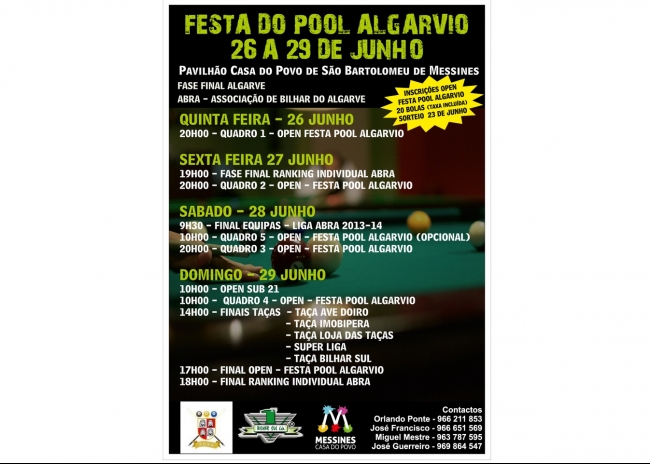 A Associação de Bilhar do Algarve escolheu, o Pavilhão da Casa do Povo de Messines como local para realizar a Festa do Pool Algarvio. Com início marcado para hoje (26 de Junho) a partir das 20h00, esta fase final irá prolongar-se até domingo (29 de Junho).