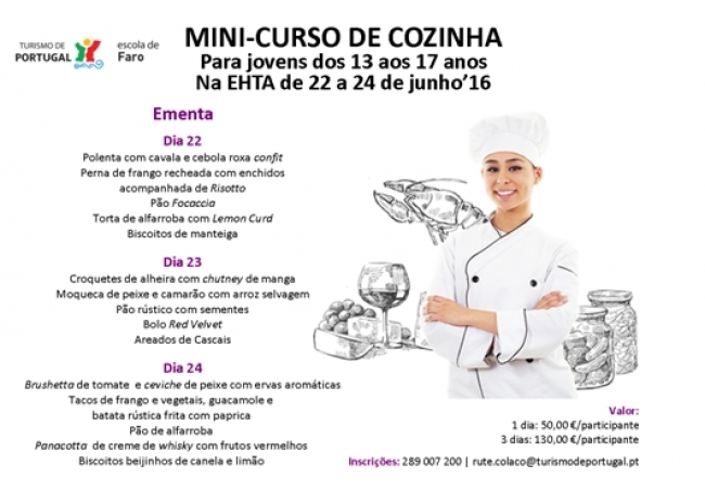 Decorrerá na Escola de Hotelaria e Turismo do Algarve um Mini-Curso de Cozinha, para jovens entre os 13 e os 17 anos, nos dias 22, 23 e 24 de junho´16 entre as 09h30 e as 16h00.