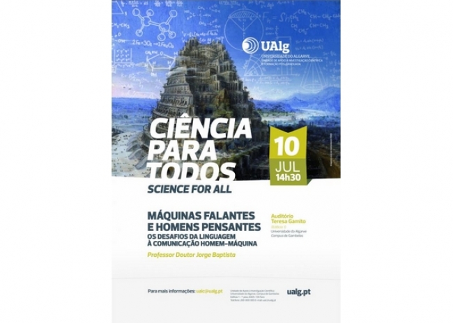 A Universidade do Algarve iniciou um ciclo de seminários intitulado Ciência para Todos, dirigido a toda a comunidade. A segunda sessão irá decorrer no dia 10 de julho, às 14h30, no Auditório Teresa Gamito (edifício 1), Campus de Gambelas, e contará com a participação do Professor Jorge Baptista, que irá falar sobre "Máquinas falantes e homens pensantes: Os desafios da linguagem à comunicação homem-máquina".