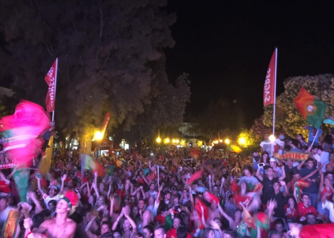 Com toda a área do jardim praticamente coberta com as cores da seleção portuguesa, também eram visíveis alguns pontos de azul, vermelho e branco das poucas bandeiras francesas pertencentes a pequenos grupos de jovens gauleses, de férias no Algarve, que aproveitaram a presença em Faro para verem o jogo na “Fanzone” da baixa da cidade.