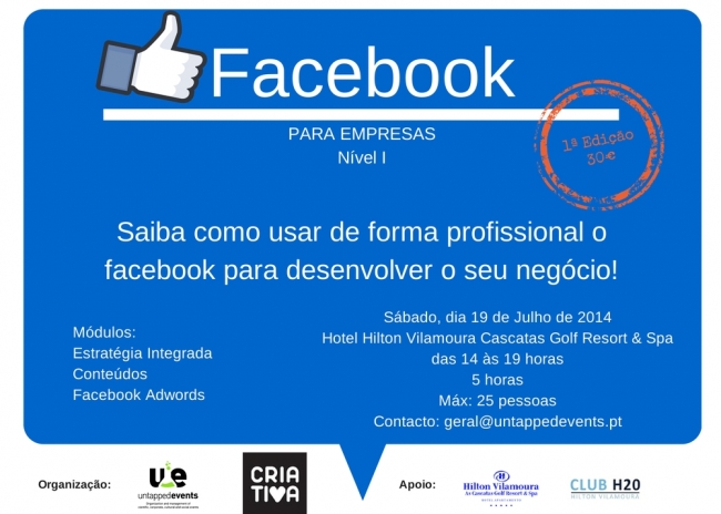 No dia 19 de Julho de 2014, irá realizar-se a formação sobre “Facebook para Empresas” no Hotel Hilton Vilamoura Cascaras Golf Resort & Spa. Esta 1ª edição contará com 5 horas de formação, das 14 às 19 horas. O número de inscrições é limitado por isso faça já a sua inscrição!