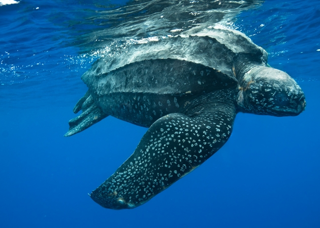 A tartaruga-de-couro (Dermochelys coriacea)é a maior de todas as tartarugas, com tamanho médio em torno de 2 m de comprimento por 1,5 m de largura e 700 kg de massa. Tem uma carapaça negra, constituída de tecido macio. A carapaça não se liga ao plastrão em ângulo, como nas outras tartarugas, mas sim em uma curva suave, dando ao animal uma aparência semi-cilíndrica. Vive sempre em alto-mar e alimenta preferencialmente de medusas e ascídias.