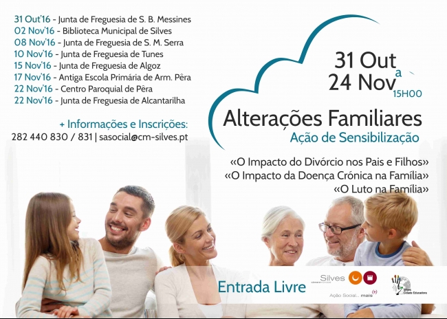Diversas ações de sensibilização para temáticas associadas a “Alterações Familiares” serão promovidas pela Câmara Municipal de Silves, nas diversas freguesias do concelho, entre os dias 31 de outubro e 24 de novembro.