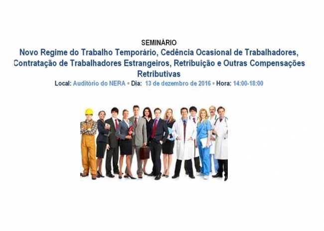O NERA em parceria com a EDUARDO SERRA JORGE E MARIA JOSÉ GARCIA – SOCIEDADE DE ADVOGADOS, RL., irá promover a realização de um Seminário subordinado ao tema “Novo Regime do Trabalho Temporário, Cedência Ocasional de Trabalhadores, Contratação de Trabalhadores Estrangeiros, Retribuição e Outras Compensações Retributivas”, a realizar no Auditório do NERA, no próximo dia 13 de dezembro, entre as 14H00 e as 18H00.