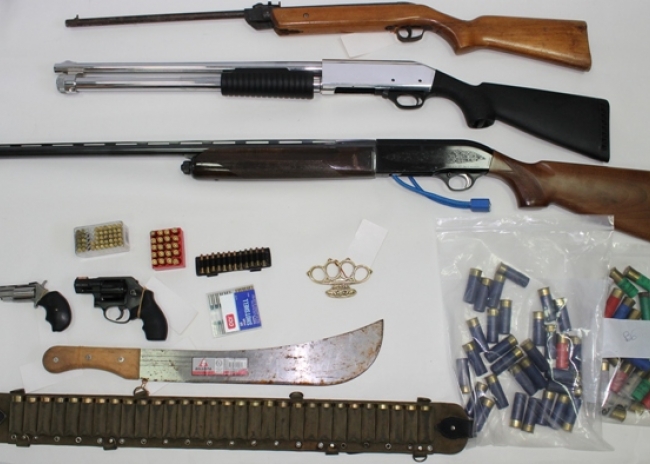 Uma arma de fogo semiautomática calibre 12 (shotgun); Uma espingarda caçadeira calibre 12; Uma espingarda de ar comprimido; Dois revólveres calibre 22; Sessenta cartuchos calibre 12; Vinte e quarto cartuchos carregados com bala, calibre 12; Setenta e uma munições calibre .22; Vinte munições calibre .32; Uma catana e Uma soqueira.