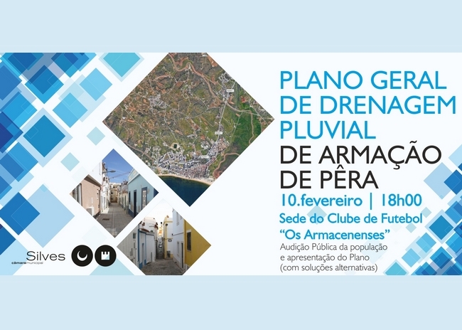 A Câmara Municipal de Silves irá apresentar publicamente o Plano Geral de Drenagem Pluvial de Armação de Pêra no próximo dia 10 de fevereiro, pelas 18h00. A sessão, que contempla, igualmente, a audição da população, irá realizar-se na sede do Clube de Futebol «Os Armacenenses».
