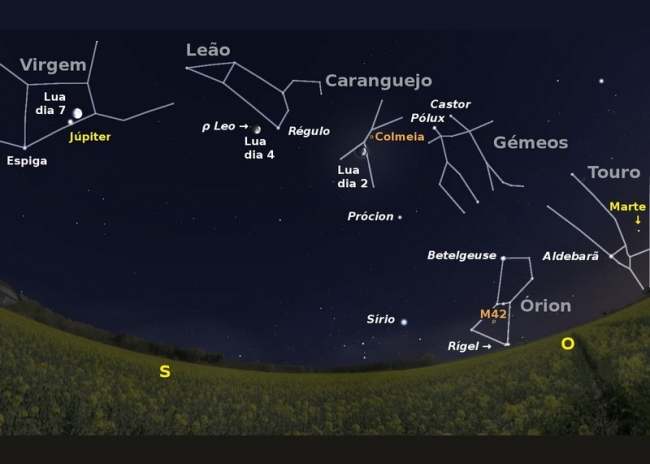 Figura 1: Céu a sudoeste pelas 21 horas e 30 minutos de dia 2 com algumas estrelas, planetas, constelações e outros objetos de destaque tais como o aglomerado estelar Colmeia e a Nebulosa de Órion (M42). Igualmente é visível a posição da Lua nos dias 4 e 7. (imagem adaptada de Stellarium)