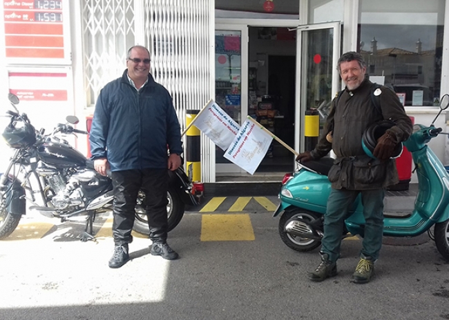 Luís Martins e António Cabaço saíram esta manhã do Algarve, por volta das 11h, em duas motorizadas de 125 centímetros cúbicos de cilindrada para a peregrinação que os levará até ao Santuário de Fátima. As motos estão identificadas com duas pequenas bandeiras com o logótipo do centenário onde pode ler-se “Diocese do Algarve, peregrinos em marcha”.
