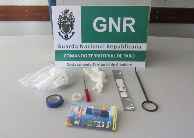 Na posse dos detidos foram apreendidos diversos objetos presumivelmente utilizados na prática do ilícito, nomeadamente uma chave de fendas, tubos de cola, rolos de fita cola/isoladora e luvas de latex.