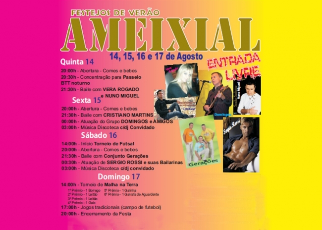 A aldeia do Ameixial vai estar ao rubro de 14 a 17 de Agosto com as tradicionais Festas de Verão. Muita música, animação desportiva (maratona de Futsal e BTT) e jogos tradicionais marcam o cartaz diversificado destas festas características do interior algarvio, promovidas pelo Grupo Desportivo Ameixialense.